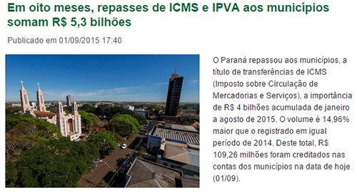 Também de janeiro a agosto foi distribuído aos municípios R$ 1,32 bilhão em recursos do IPVA (aumento de 40,55%). Agora, reparou na foto usada pelo governo? É de Campo Mourão! Olha aí, quem disse que o governo não se lembra da gente?...