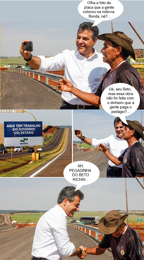 O governador Beto Richa esteve nesta quinta-feira em Engenheiro Beltrão para a entrega de trecho de 11 km da duplicação da PR-317. Olha só a faixa que colocaram por lá: “Obrigado governador por mais uma obra”. Ué, mas se foi o governo que fez, por que a gente tá pagando pedágio para concessionária?...