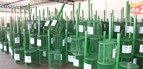 São 300 lixeiras de ferro e 50 de madeira.