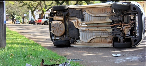 Aconteceu outra vez. Um Peugeot 208 ficou assim, virado no meio da avenida, em acidente nesta quarta-feira, no centro de Campo Mourão. Foi na av. Irmãos Pereira, esquina com rua Pitanga. O 208 foi fechado por um WV Up, que seguia pela mesma via. Por sorte, ninguém se feriu.