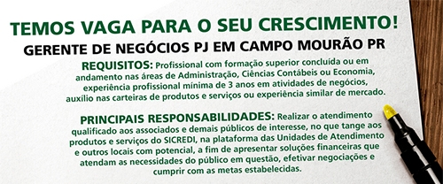 Que tal ser gerentede negócios pessoa jurídica do Sicredi de Campo Mourão? Pois fique sabendo que tem vaga. As inscrições para o processo seletivo ficam abertas até o próximo dia 5. É preciso ser formado (ou estar quase se formando) em administração, contábeis ou economia, e ter três anos de experiência em negócios e mercado.