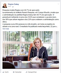 A prefeita Regina Dubay comentou a pesquisa pelas redes sociais.