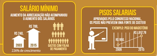 O material também critica aumentos de pisos salariais, como o do magistério, que foi de R$ 950 em 2009 para R$ 1,9 mil em 2015.