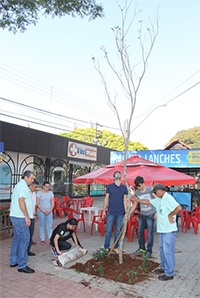 Demorou um pouquinho, mas foi plantada nova árvore no calçadão no lugar daquela que foi derrubada por um carro. O plantio aconteceu nesta segunda-feira, quando se comemorou o Dia da Árvore (21 de setembro). Teve mais duas árvores derrubadas por carro na mesma quadra, mas essas deram um jeitinho de tapar os buracos para ninguém lembrar que já teve vegetação por ali...