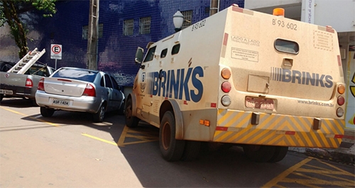 Rua São Paulo, quase esquina com a av. Capitão Índio Bandeiram nesta terça-feira à tarde. Carro-forte estaciona em frente a guia rebaixada (entrada e saída de veículos). Acabou multado. Carros-fotes têm privilégios previstos em lei, mas não podem obstruir o trânsito.