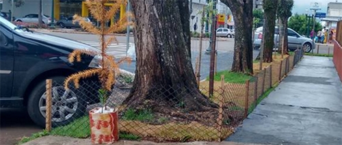 “Parte da calçada ganhou ‘cerquinha’ na esquina da av. Irmãos Pereira com a rua Mato Grosso, no centro de Campo Mourão. Parece que foi para proteger a grama plantada no local, o que foi foge do padrão de calçamento exigido para o centro da cidade”.