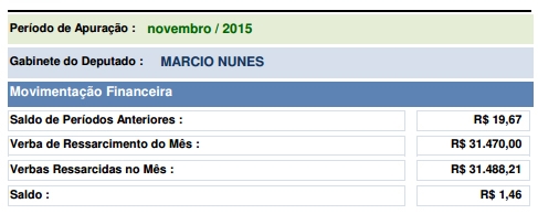 O gabinete do deputado Márcio Nunes fechou 2015 com sobras em caixa de R$ 1,92.