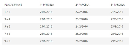 Pra quem não via a hora de pagar o IPVA 2016, chegou o dia. Vence nesta quinta-feira o imposto de quem tem carro com placa finais 1 e 2. Na sexta será a vez dos finais 3 e 4 (veja acima). Quem pagar à vista ganha “descontão” de 3%. Outra opção é parcelar em três vezes, com a primeira parcelinha vencendo hoje também. Em Campo Mourão o imposto deve render R$ 28 milhões. Metade fica com a prefeitura.