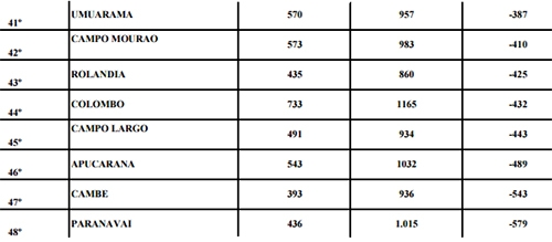 Ficaram para trás da gente, por exemplo, Apucarana (46º), Paranavaí (48º), Toledo (51º) e Cianorte (54º).