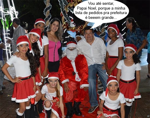 O clic é de Corumbataí do Sul, onde aconteceu no fim de semana a chegada do Papai Noel. Foi na praça São Pedro, com distribuição de balas e brinquedos para as crianças. O prefeito Carlos Caxão participou, com direito a uma conversa com o “bom velhinho”. Hummm, pode pedir aumento da arrecadação?...