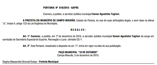 Itamar Tagliari não é mais o secretário de Esportes de Campo Mourão.