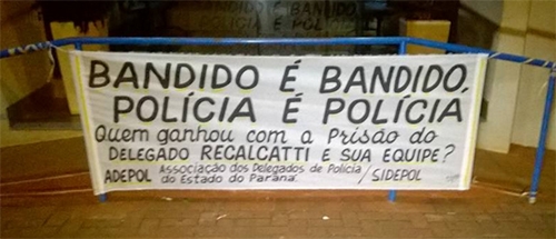 Em Campo Mourão, uma faixa foi colocada em frente à 16ª SDP. “Quem ganhou com a prisão do delegado Recalcatti e sua equipe?”, questiona a faixa, assinada pela associação e pelo sindicato dos delegados de polícia do Paraná.