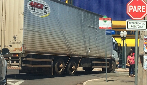 “Fora do horário de carga e descarga, caminhão baú passa pelo centro de Campo Mourão, na manhã desta quinta-feira. O flagra é da esquina da av. Capitão Índio Bandeira com a rua São Paulo”.