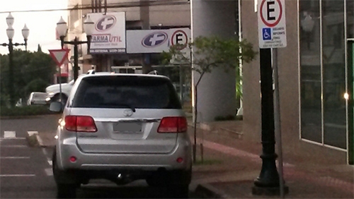“Carro estacionado em frente à Câmara, em local pra deficientes, conforme mostra a placa e a rampa na calçada. Veículo estava em cartão no painel”.