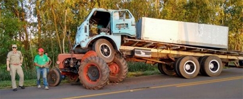 Olha só onde foi parar o “Alfão”, em cima do trator. O acidente aconteceu nesta quinta-feira na PR-082, entre Terra Boa e Cianorte. Segundo a Polícia Rodoviária, o trator foi “atropelado” quando fazia o reboque do caminhão Alfa Romeo. O motorista do trator ficou ferido e foi encaminhado para um hospital de Cianorte.