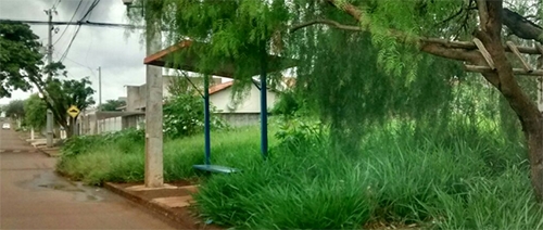 “No jardim Albuquerque, mato de terreno baldio invade a calçada e ‘cerca’ ponto de ônibus”.