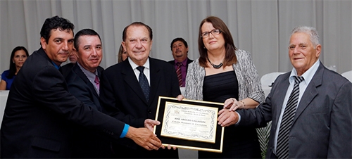 O presidente da Coamo, José Aroldo Gallassini, agora é cidadão honorário de Cruzmaltina, no centro-norte do Estado. A honraria foi proposta pelos vereadores Vilson Castro e Marcos Grégio e entregue em sessão solene realizada nesta quarta-feira no salão paroquial da cidade. Gallassini já tem mais de 40 títulos em municípios do Paraná, Santa Catarina e Mato Grosso do Sul. A Coamo tem entreposto em Cruzmaltina há dois anos.