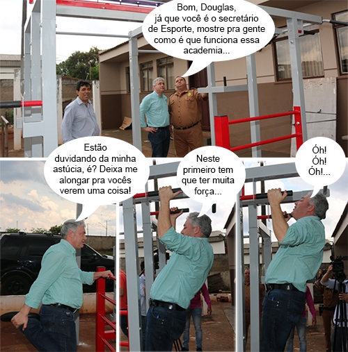 Os cliques são desta quinta-feira, quando o secretário de Estado Douglas Fabrício (Esporte e Turismo) esteve no 11º BPM. Junto com o comandante, o tenente-coronel Mauro Lúcio dos Santos, e o vereador Sidnei Jardim, foi conferir a Estação Saúde instalada no batalhão. Tudo conseguido pela pasta, após pedido de Jardim. Aí, já viu, não basta conseguir o equipamento, tem que mostrar pra que serve...