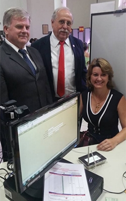 A Justiça Eleitoral começou na terça-feira o cadastramento biométrico na comarca e a prefeita de Farol, Ângela Kraus, não quis perder tempo, não. Compareceu logo na abertura dos trabalhos e foi a primeira farolense a se cadastrar. Olha ela aí, observada pelo presidente do TRE, desembargador Jucimar Novochadlo, e pelo juiz Rui Antonio Cruz. Ah, digamos que, como quem não se cadastrar fica impedido de votar, Ângela não quis se arriscar...