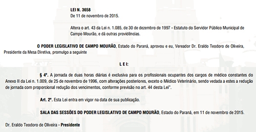 O presidente da Câmara, Eraldo Teodoro, promulgou a lei que reduz para duas horas a carga horária dos médicos nos postos de saúde.