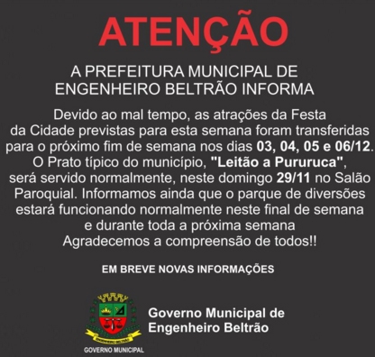 A festa de aniversário de Engenheiro Beltrão, que começaria nesta quinta-feira, foi adiada para a semana que vem.