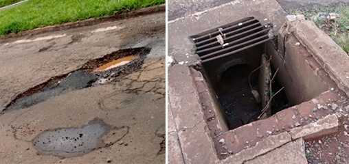 “Situação da av. Presidente John Kennedy (Lar Paraná), em frente a Colacril. Na esquina com a rua Pavão várias pessoas caíram nos buracos. E ainda tem bueiro aberto, que à noite não dá pra ver”.