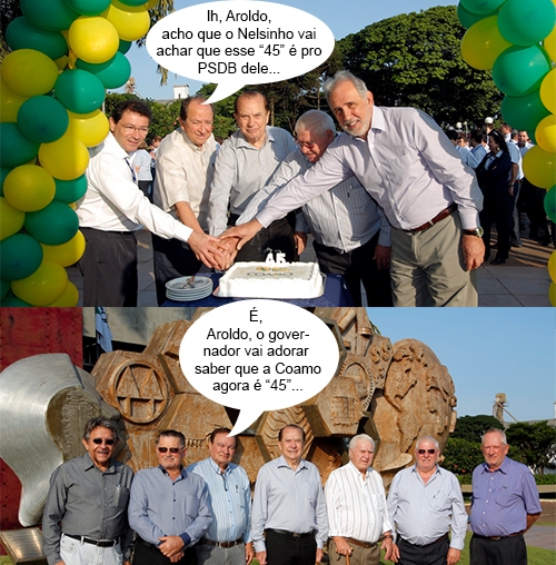 A Coamo completa 45 anos de fundação neste sábado. Pra comemorar, teve corte de bolo nesta sexta-feira. O presidente José Aroldo Gallassini, diretores, fundadores, cooperados e funcionários participaram do “parabéns pra você”. Entre os presentes, o presidente do Sindicato Rural, Nelsinho Teodoro, que conhece bem outro “45”, o do PSDB do governador Beto Richa...