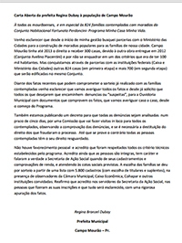 A prefeita Regina Dubay divulgou nesta quarta-feira uma “Carta aberta à população de Campo Mourão”.