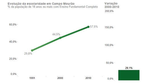 Você sabe quantos por cento do população de Campo Mourão, com mais de 18 anos, tem o ensino fundamental completo? Hoje são 57,5%. Mas eram apenas 29,8% eem 1991. E 44,5% em em 2000. Somente no período de 10 anos, entre 2000 e 2010, houve crescimento de 29,1% nesses índices. O jornal Gazeta do Povo fez um levantamento em todos os 399 municípios do Paraná.