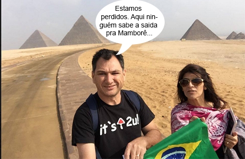 Olha aí o prefeito de Mamborê, Nei Calori, conferindo as pirâmides do Egito. Ele e a primeira-dama Vânia Rodrigues foram à “terra da múmia” participar da Conferência Mundial da Família. Da região também esteve por lá o prefeito de Ubiratã, Baco Duarte. Despesas bancadas por uma entidade que convidou os prefeitos. E nada de trazer as "pragas do Egito" na bagagem, hein?...