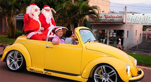 Chega essa época do ano, já viu, toda prefeitura organiza a tal da “chegada do Papai Noel”. E cada uma dá o seu toque. Em Terra Boa, o “bom velhinho” chegou na quarta-feira: de Fusca conversível amarelo. Repare que à frente está o prefeito Valter Peres. Agora, cá pra nós: dois papais noéis? Ah, um só não dá mais conta de tanto pedido...
