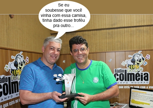 O clic é deste sábado, quando o secretário de Estado Douglas Fabrício (Esporte e Turismo) foi a ao programa Tocando de Primeira (rádio Colméia) para entregar o troféu “Orgulho do Paraná” ao apresentador Ilivaldo Duarte. Agora, cá pra nós: com a final da Copa do Brasil ainda tão fresquinha, o santista Douglas não deve ter gostado nada dessa camisa verde do Ilivaldo...