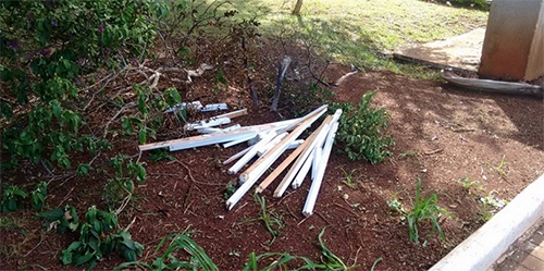 “Olha o lixo jogado na praça São José, bem do ladinho da rua Brasil. De longe parece lâmpada, mas são peças de madeira”.