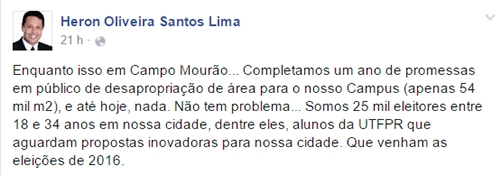 O diretor da UTFPR de Campo Mourão, Heron dos Santos Lima, criticou a prefeitura em postagem no Facebook.