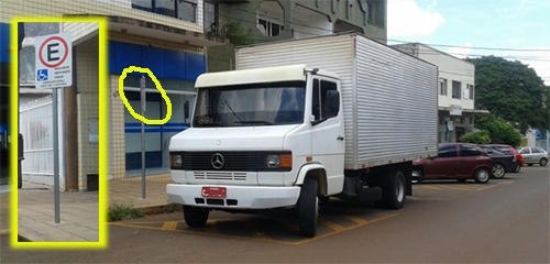 Dois flagrantes num local só, na manhã desta sexta-feira, no centro de Campo Mourão. Caminhão estaciona sobre o calçadão da av. Capitão Índio Bandeira e, ao mesmo tempo, sacos de lixo são usados para reserva vaga no estacionamento púbico.