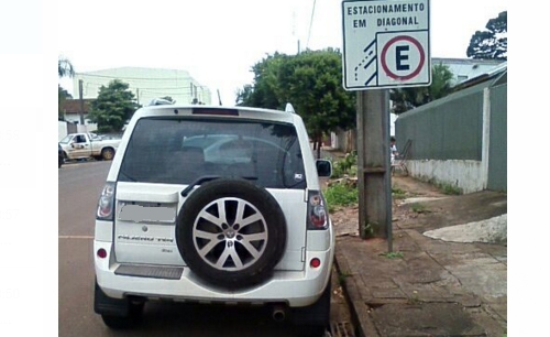 Rua Mato Grosso, centro de Campo Mourão, nesta quinta-feira. Caminhão estaciona em vaga reservada para portadores de deficiência física.