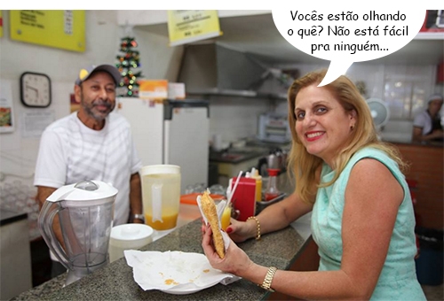 Olha aí a prefeita Regina Dubay comendo um pastelzinho na pastelaria Tokio, no centro de Campo Mourão. Foi nesta terça-feira, entre um despacho e outro. Regina passará a revirada do ano em Curitiba, onde a mãe, dona Alzira Bronzel, segue internada.