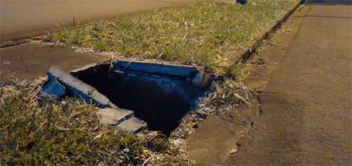 Cuidado ao transitar pela av. José Custódio de Oliveira. Na esquina da rua Araruna, a tampa de concreto de bueiro do canteiro central foi quebrada e restou apenas o buracão a espera de um pedestre desavisado”.