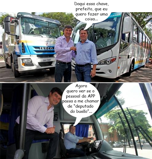 Os cliques são desta sexta-feira, em Terra Boa, quando o prefeito Valter Peres recebeu um ônibus e um caminhão para coleta de lixo. A entrega foi feita pelo deputado Márcio Nunes, que deu uma mãozinha na liberação dos recursos. Os veículos custaram R$ 348 mil, sendo R$ 240 mil liberados pelo Estado e R$ 108 mil da prefeitura. No mais, cá pra nós: melhor busão que camburão...