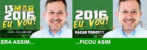 Lembra que o ex-prefeito Tauillo Tezelli postou no Facebook um banner informando que iria à manifestação de domingo? Usuários da rede social não perderam tempo e fizeram uma montagem sobre a arte. Ao invés de dizer que iria ao evento, Tauillo aparece dizendo que vai “pagar todos”. Foi uma ironia a dívidas da empresa dele, que está em recuperação judicial.