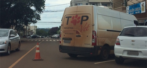 Na rua Brasil, centro de Campo Mourão, van inova na hora de estacionar em diagnonal e deixa cone para sinalizar a “invasão” na pista.