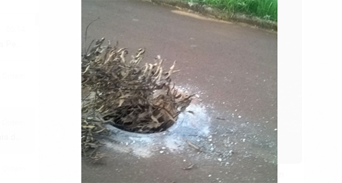 “Bueiro aberto no jardim América há mais de um mês sendo sinalizado por galhos de árvores e madeiras”.