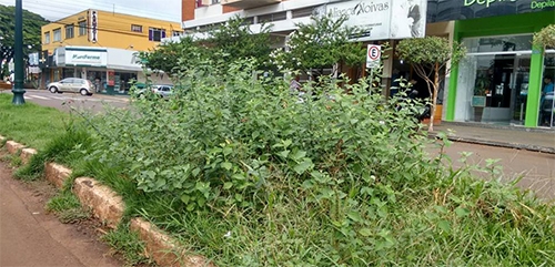 Algum tempo atrás a prefeitura substituiu o concreto do canteiro central da av. Manoel Mendes de Camargo por grama. Ficou mais bonito, mais ecológico e mais agradável. Só tem um probleminha: na grama nasce mato e se ninguém cortá-lo pode ficar desse jeito aí, entre as ruas São Paulo e Mato Grosso.