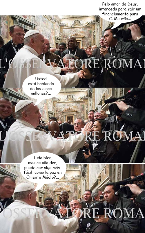 Olha aí mais cliques do encontro do padre Adilson Naruishi, da Catedral São José, com o papa Francisco. Foi terça-feira, em Roma, com direito a registro do “L’Osservatore Romano”. Claro que Boca Santa não iria perder a chance de colocar uns balõezinhos nas fotos, afinal, não é todo dia que se conversa com o papa por aí...