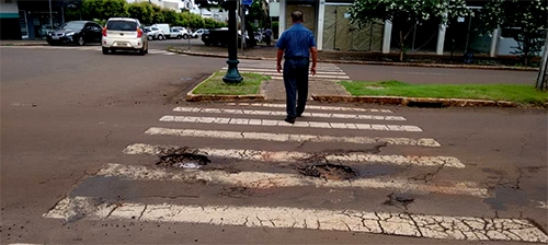 Campo Mourão tem fama de cidade onde se respeita a faixa de pedestre. Não é bem assim, já que esse respeito se limita à área do calçadão. Agora, no entanto, foi adotado sistema na av. Manoel Mendes de Camargo para forçar o respeito. Há buracos na faixa, o que quer dizer que o motorista ou reduz a velocidade por bem ou por mal...