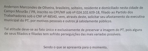 Anderson Marcondes protocolou nesta segunda-feira o pedido de afastamento da executiva do PT de Campo Mourão.