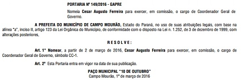Que o advogado Cesar Ferreira assumiria cargo na prefeitura a partir de março Boca Santa já tinha divulgado.