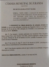 A Câmara de Juranda não perdeu tempo, não. Na segunda-feira ficou esperando até chegar uma decisão favorável do Judiciário para poder votar a cassação de três vereadores. O trio acabou cassado por nove votos a zero. Nesta quarta-feira já saiu publicada a portaria que oficializa a cassação de Pedro Gonçalves, Nelson Richard Pinto e José Theodoro Alves Neto. A portaria determina que a decisão seja comunicada à Justiça Eleitoral. Os três cassados já estavam afastados da Câmara desde novembro.