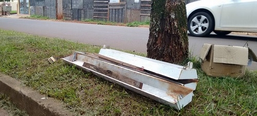 Quem disse que somente lâmpadas fluorescentes são deixadas pelos canteiros centrais de Campo Mourão? Na av. Goioerê, perto da rua São José, deixaram até as calhas. Agora só falta descobrir onde tem o o reator e os interruptores...