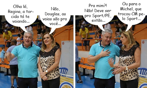 Os cliques são desta quinta-feira, no intervalo do jogo entre Campo Mourão e Sport/PE, pela Liga Ouro de Basquete. A prefeita Regina Dubay e o secretário Douglas Fabrício foram homenageados pela Amobasquete, mas acabaram ouvindo vaias de torcedores. Ah, agora umpode sair dizendo que a vaia foi pro outro...